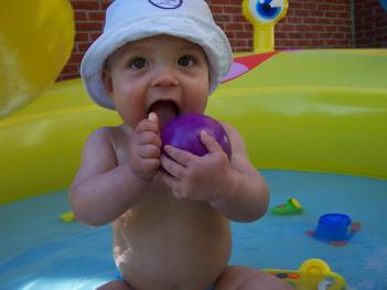 Maar ik denk dat ik nog wat langer ga wachten. Voor de rest amuseer ik me te pletter in mijn mooie badje. Water is een superuitvinding geweest. Wie heeft dat ook al weer gemaakt? Einstein? Ik ben ook flink aan het eten, maar het eten van mama en papa vind ik toch het lekkerste.